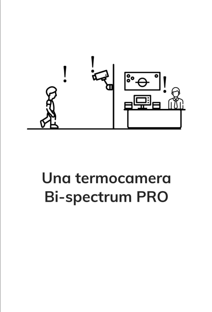 Termocamera Bi-spectrum PRO Questo sistema di rilevazione della temperatura identifica il volto delle persone e ne legge la temperatura della fronte. L’abbinamento di un dispositivo di calibrazione posizionato nell’ambiente, determina un riferimento di temperatura costante per la telecamera. In questo modo viene migliorata la precisione di rilevazione da 0,5 a 0,3° C. Nel momento in cui la temperatura di una persona supera la soglia prefissata, questa viene identificata, memorizzata e vengono attivati tutti i protocolli di sicurezza previsti